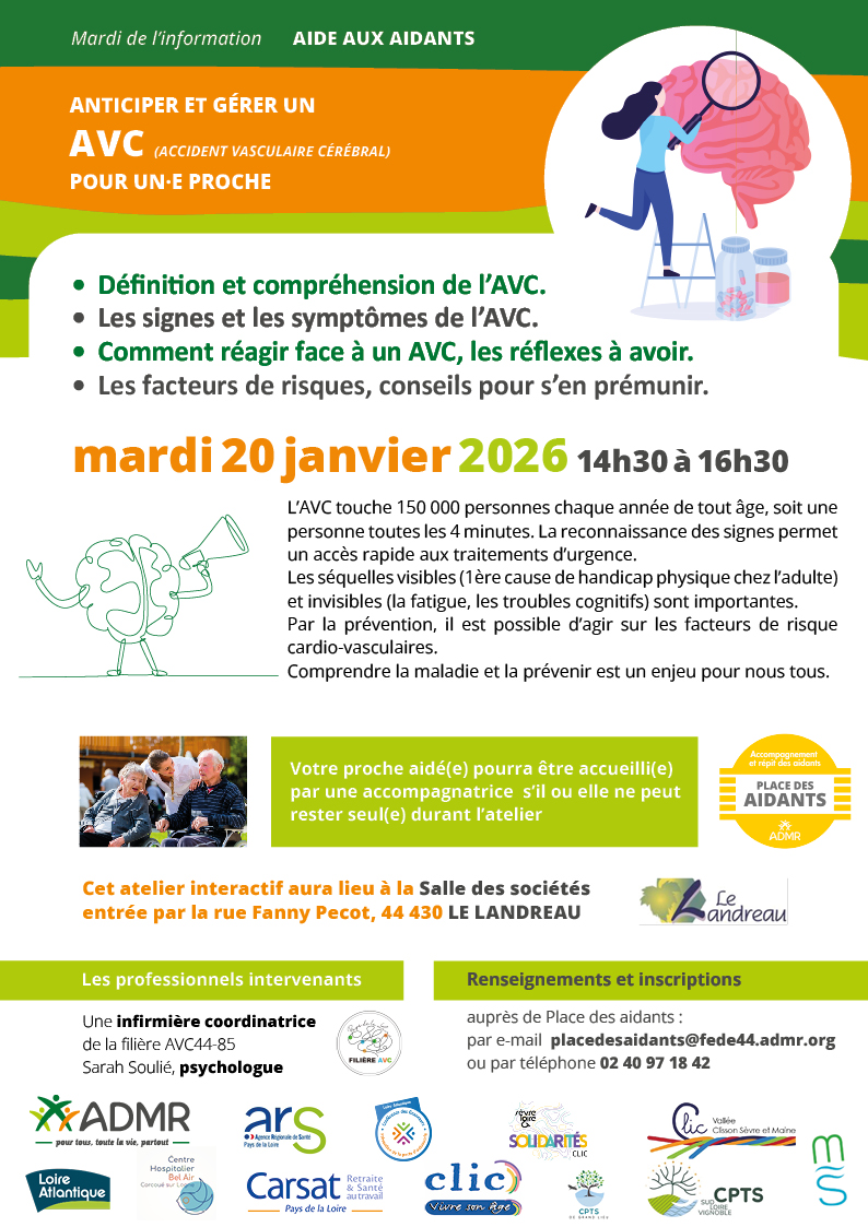 L'atlier sera animé par une infirmière coordinatrice de la filière AVC44-85 et la psychologue de Place des aidants